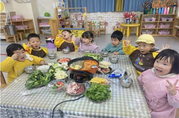 美食味觉,共享喜悦。为开启幼儿味觉盛宴,组织全体师生开展自助火锅美食活动,小朋友们纷纷从自家带来各种不同蔬菜、肉食,在老师的指点下,由小朋友们亲自洗菜、煮菜,共同品尝自己辛勤制作的美食,相互谈感受并分享心中成功的喜悦,烘托节日氛围。