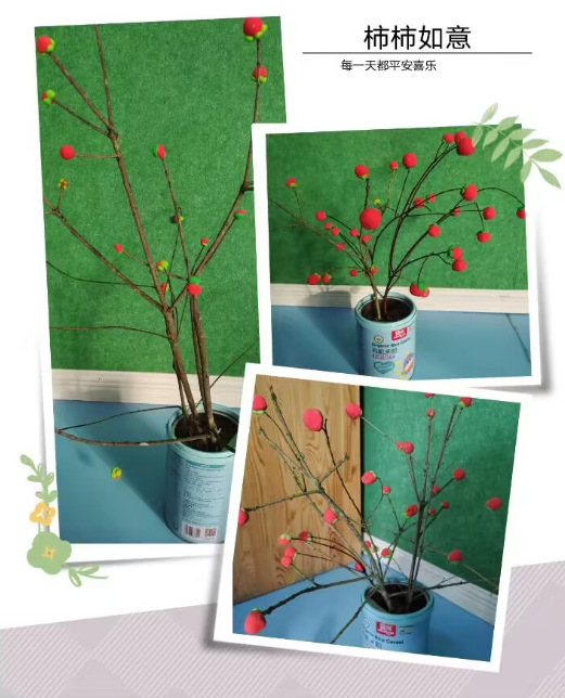 不同颜色的粘土及树枝。幼儿利用一些技能:搓圆、按压等制作出可可爱爱的小柿子,再将做好的小柿子挂在树枝上,作品就完成啦!