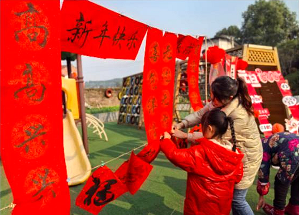活动中,家长观看孩子们展示特色活力操,孩子们个个精神饱满,积极向上。全园师生、家长一起写对联,拓印“福”字,一起参加亲子游戏“趣味套蔬菜”,孩子们领取了老师们精心准备的新年福袋,希望在新的一年里福气多多,福气满满。整个幼儿园都洋溢着新年的喜气和热闹。