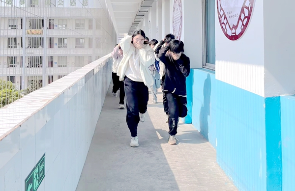 上午10时,随着警报声响起,应急疏散演练正式开始。各班教师立即组织学生按照应急预案有序撤离。学生们用湿毛巾捂住口鼻,保持"弯腰、低姿、靠右"的姿势,沿指定路线快速疏散。各楼层疏导教师全程值守,确保通道畅通。仅用58.57秒,全校500余名师生就安全撤离至操场指定区域,较去年演练时间缩短约11%。