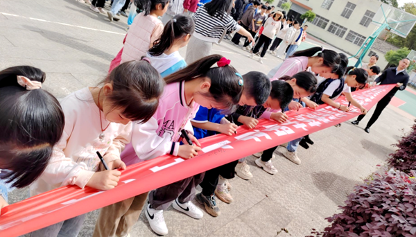 宣誓完毕,进入了庄重的防溺水安全签名环节。同学们排着整齐的队伍,依次走到横幅前,拿起笔,认真地在横幅上签下自己的名字。一笔一划,饱含着对生命的敬畏,也承载着自己对防溺水安全许下的郑重承诺。老师们也纷纷加入签名队伍,以身作则,为学生们树立重视安全的榜样。一时间,签名现场气氛热烈而庄重,一条长长的横幅上,签满了全校师生的名字,宛如一幅守护生命的壮丽画卷。