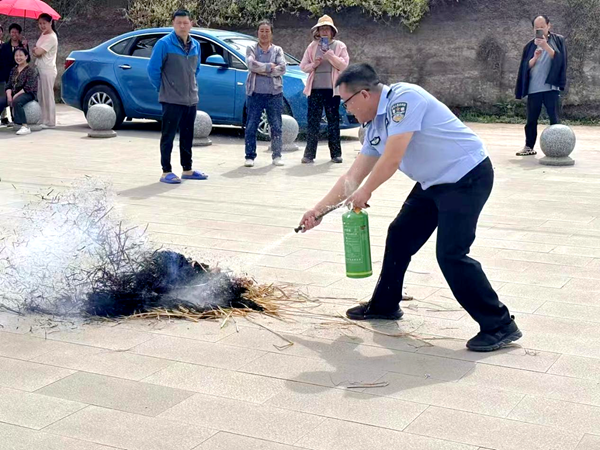 随着警报声响起,全园师幼立即停止一切活动,根据预案流程进入戒备状态。教师组织幼儿掩住口鼻,弯腰低姿,有序、安全地从疏散通道撤离至安全区域。安全疏散后,杜警官讲解了灭火器的使用方法,教师和家长代表实操灭火。强调“小火灭、大火逃”,幼儿观摩学习及体验,增强防火意识。
