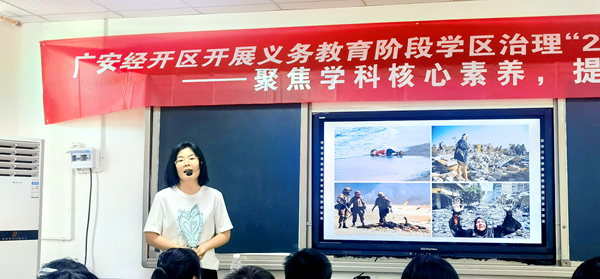 针对广安市中考改革新动向,广安五福学校吴超副校长作《广安中考改革背景下初三年级复习备考的思考与策略》专题讲座。她结合中考命题趋势,从“精准研读政策”“科学规划路径”“分层靶向突破”三方面提出备考建议,强调以素养立意、以问题为导向,优化复习策略。讲座内容详实、案例丰富,为两校教师把握改革方向、提升备考实效提供了专业指导。