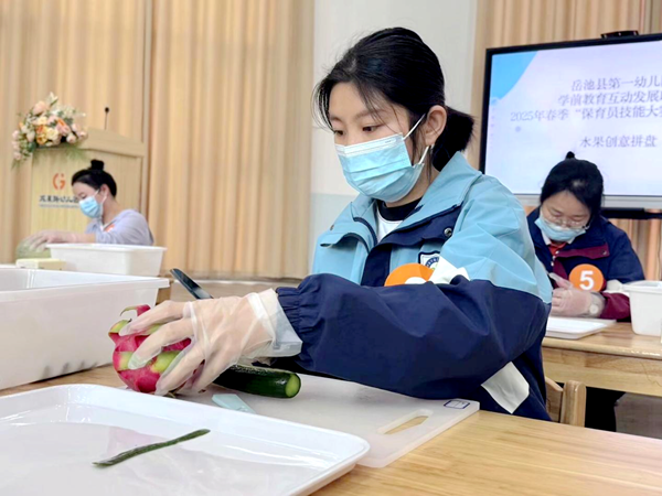 接着,参赛的保育员们在25分钟内完成水果削切与创意摆盘,并进行简单讲解,展现了保育员的美育素养与创新能力。