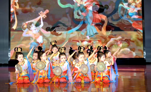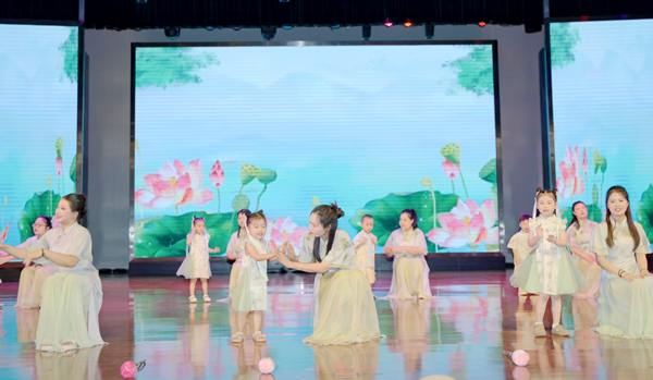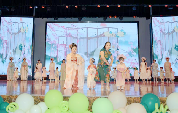 活动中,全体师幼和家长们轮番登场,节目精彩纷呈!舞台上,幼儿舞蹈《中华孝道》传递着传统美德,《飞天乐鼓》的小舞者们化身敦煌仙子,手持铃鼓翩翩起舞;《百家姓》《唐宫夜宴》里,孩子们用稚嫩的表演带大家穿越千年,感受中华文化的魅力。亲子节目温馨欢乐,有的手持睡莲,手牵手演绎江南水乡的诗情画意;有的化身小唐俑、小道童,一举一动萌态十足;更有亲子走秀,孩子们穿着精美的汉服、旗袍,牵着家长的手自信迈步,仿佛从画卷中走出的小仙子、小书生。老师们也带来惊喜,《霓裳乐舞》的古典优雅与《桃花笑》的俏皮灵动,赢得阵阵掌声。川剧变脸表演最让人惊叹,脸谱瞬间变换,孩子们瞪大眼睛,纷纷拍手叫好。