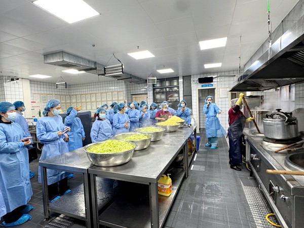 活动开始时,家长代表们在园方工作人员引导下,完成签到、消毒、穿戴专用工作服、帽子及口罩等规范流程后,化身"食品安全监督员",有序走进平日"闲人免进"的食堂核心区域。在后勤主任与食堂负责人的全程陪同讲解下,家长们依次参观食材验收区、加工间、切配区、烹饪间、备餐间、餐具洗消间、食品留样室及冷藏保鲜库等功能区域,实地查看后厨环境卫生、设施设备、物品摆放与操作规范。从清晨食材入园的"三查三验"(查资质、查品质、查票据;验重量、验新鲜、验检测报告),到分类储存的色标管理、生熟严格分开;从清洗切配的精细化操作,到烹饪过程的规范有序;从餐具"一刮、二洗、三冲、四消毒、五保洁"的标准化流程,到每餐食品详细登记的严谨制度,每一个环节都清晰展现在家长眼前。园方重点介绍食品安全"五关"管理体系——严把进货溯源关、入库验收关、加工操作关、餐具消毒关、食品留样关,让家长直观感受幼儿园"源头可溯、过程可控、安全可查"的全链条食安管控模式。同时,家长们通过大厅实时监控屏幕,同步观看后厨各岗位操作画面,感受"互联网+明厨亮灶"智慧监管的便捷与高效,真正实现食品安全"看得见、摸得着、信得过"。