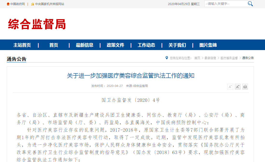 针对医疗美容行业存在的乱象问题,2017-2018年,原国家卫生计生委等7部门联合部署开展了为期1年的严厉打击非法医疗美容专项行动,取得了一定成效。近期,监管中发现医疗美容乱象有所抬头,为进一步净化医疗美容市场,保护人民群众身体健康和生命安全,贯彻落实《国务院办公厅关于改革完善医疗卫生行业综合监管制度的指导意见》(国办发〔2018〕63号)要求,现就加强医疗美容综合监管执法工作通知如下: