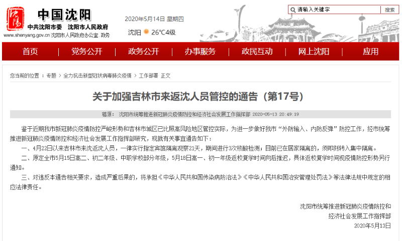 5月13日,沈阳市统筹推进新冠肺炎疫情防控和经济社会发展工作指挥部发布《关于加强吉林市来返沈人员管控的通告(第17号)》称,4月22日以来吉林市来沈返沈人员,一律实行指定宾馆隔离观察21天,期间进行3次核酸检测;目前已在居家隔离的,须即刻转入集中隔离。同时,原定全市5月15日高二、初二年级、中职学校部分年级,5月18日高一、初一年级返校复学时间向后推迟。