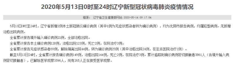 ▲2020年5月13日0时至24时辽宁新型冠状病毒肺炎疫情情况