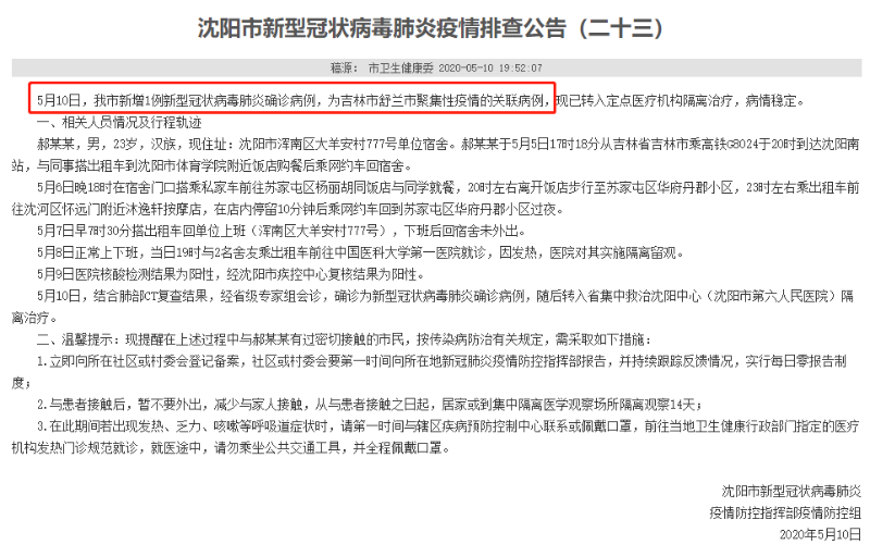 据了解,5月11日,沈阳曾紧急发布通告,表示对吉林市来沈返沈人员实行分级分类管理,对4月22日以来舒兰市来沈返沈人员,一律实行指定宾馆集中隔离观察14天,其间进行2次核酸检测。强化发热门诊规范服务,就诊患者须进行1次核酸检测,严格执行“一人一诊室”“一患一陪护”制度。