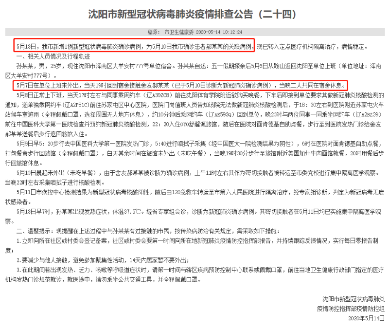 5月14日,沈阳市疾控中心主任孙百军在新闻发布会上表示,继5月10日该市发生1例吉林市舒兰市新冠肺炎聚集性疫情关联病例后,又连续出现2例与该病例关联的新冠肺炎确诊病例。