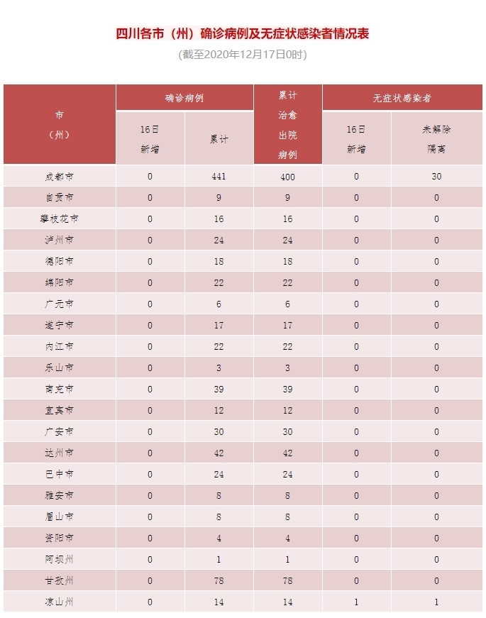 12月16日0-24时,四川无新增新型冠状病毒肺炎确诊病例,新增治愈出院病例3例,无新增疑似病例,无新增死亡病例。