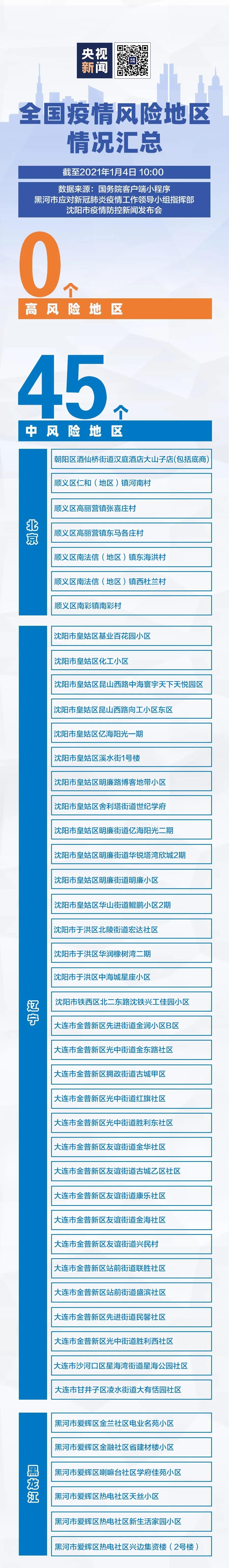 据央视新闻报道,截至2021年1月4日10时,全国共有45个地区调整为中风险地区。