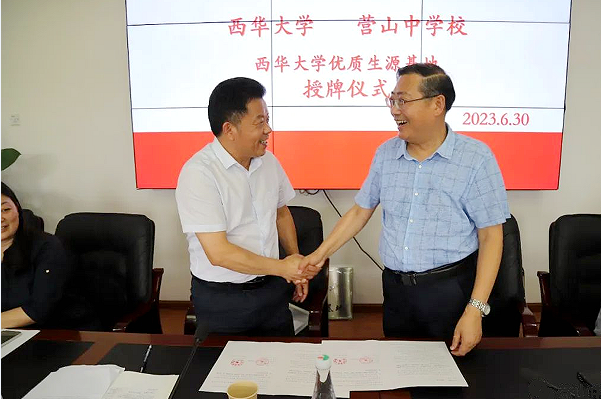 营山中学党委书记、校长曾振宇介绍了学校办学历史、办学理念、办学成绩,他指出:西华大学是一所工、理、管、法、经、艺、文、教、农、医等多学科协调发展的高水平综合性大学。营山中学成为西华大学优质生源基地,为高校人才选拔和高中人才输送建立新的交流平台。希望以此为契机,进一步扩大双方在师资培养、学术交流、学生生涯规划指导等方面的全方位合作,特别是充分发挥西华大学高校学术优势、资源优势、平台优势,在培养学生自主、探究、创新能力方面给予积极支持,携手为中华民族伟大复兴培养更多拔尖创新性人才。