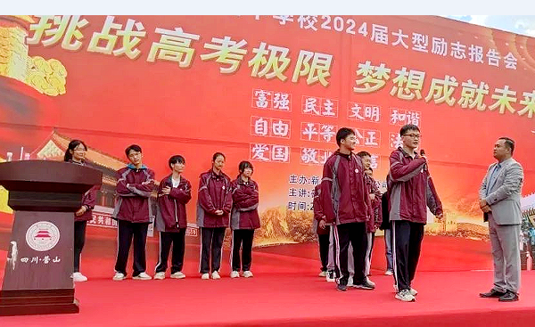 演讲结束后,师生集体宣誓。班主任纷纷上台,表达了关爱学生、培育栋梁的决心,随后各班学生也庄严宣誓,铮铮誓言,气贯长虹,彰显了同学们决胜2024年高考的信心和勇气。 高2021级年级处蒋超主任作了总结发言,他希望同学们能在此次大会中受到启发,树立远大理想,咬定目标不放松,在学习、生活各方面严格要求自己,养成良好的习惯,互帮互助,共同努力。(王卓悟 薛瑞)