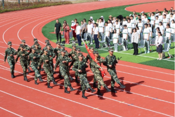 由护校队组成的仪仗队缓缓向升旗台走来,在嘹亮的国歌声中,五星红旗冉冉升起,迎风飘扬,全校师生共同见证这一庄严时刻,开学典礼拉开帷幕。