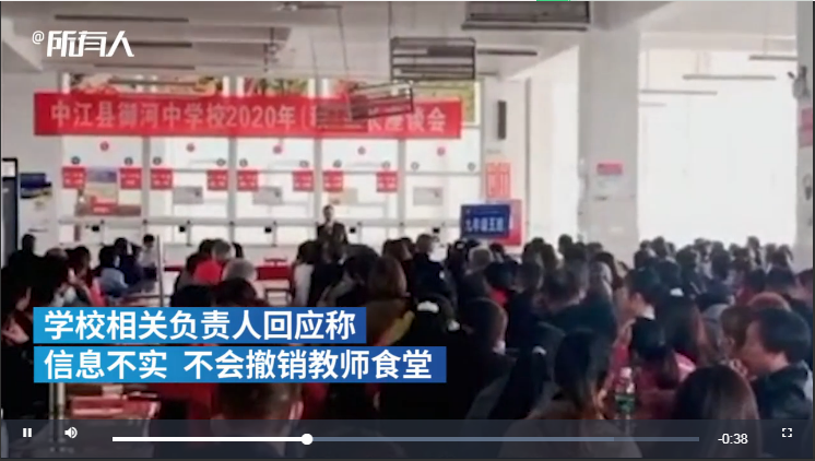近日,四川德阳。一段视频显示,中江县御河中学校长在家长会上宣布,称撤销教师食堂,师生共同用餐。教育局回应,当地教师与学生一直共同用餐,视频为家长炒作,信息不实。