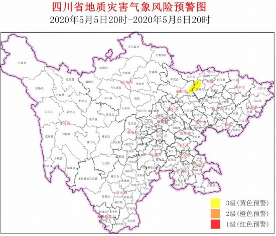 5月5日,记者从四川省自然资源厅获悉,结合四川省气象台天气预报情况,5月5日20时~5月6日20时,全省地质灾害气象风险预警结果如下: