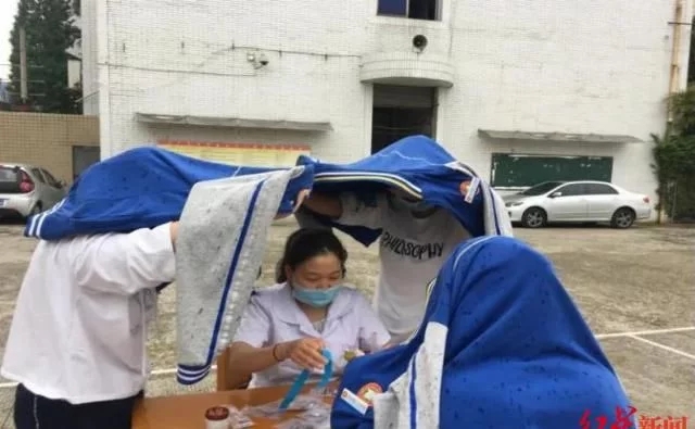 记者联系到当天现场两名学生,一名撑“伞”的学生是广汉中学高三八班学生黄宇婷。图中正在抽血的学生是她的同学杨珍珠。