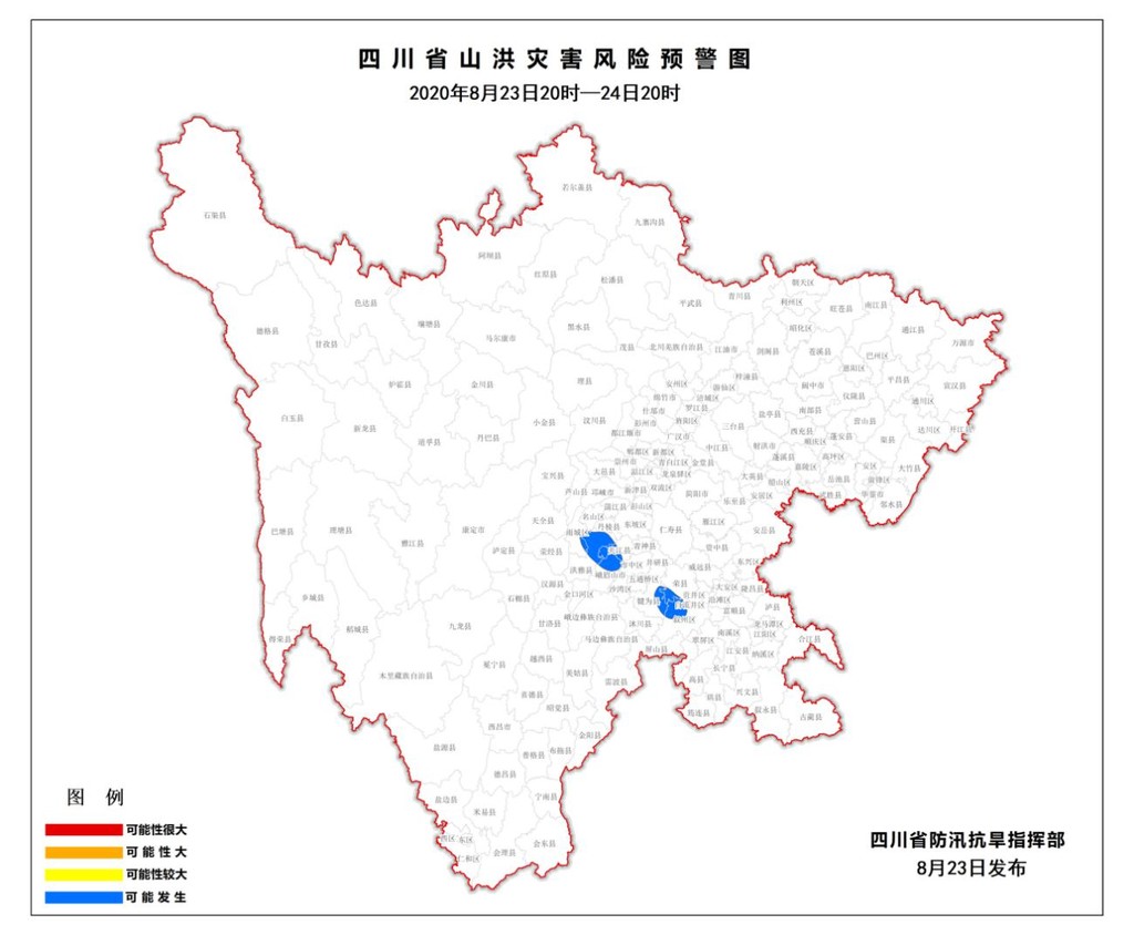 8月23日17时30分,四川省防汛抗旱指挥部发布山洪灾害蓝色预警。