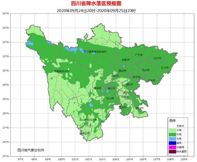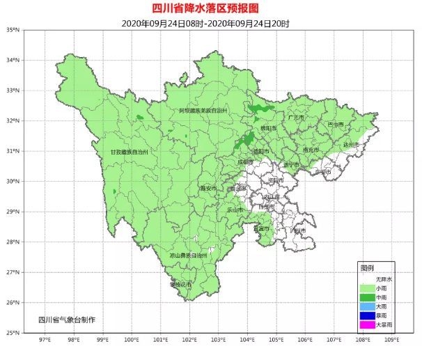 今天晚上到9月25日白天,全省阴天有小到中雨,其中盆地西部、川西高原北部及攀西地区北部局部地方有大雨。