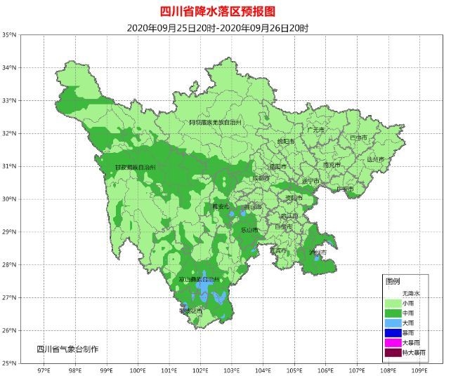 9月25日晚上到26日白天,全省阴天有小雨到中雨,其中盆地西南部、攀西地区南部局部地方有大雨。