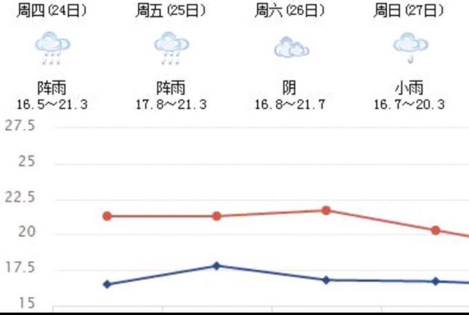 24日晚上到25日白天阴天有小雨到中雨,气温17~22℃;