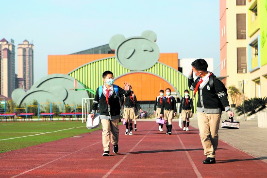 在熊猫路小学门口,五六年级的“小神兽们”就在领队老师的指引下,按照地面一米间隔线有序排队通过体温监测,进入阔别已久的校园。