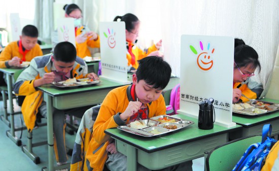在西南财大附属小学,12点刚下课,食堂工作人员早已把密封好的饭菜送到班级门外,孩子们按照间隔,一个接一个排着队,有序地去洗手,并按秩序去领餐。然后,同学们回到自己的“小隔间”,安静地就餐。班主任和副班主任老师负责为孩子们打饭。