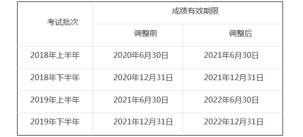 参加“2018年上半年至2019年下半年”各批次笔试,已通过的单科笔试科目成绩有效期延长1年,即成绩有效期由2年延长至3年,成绩查询网站页面会及时更新有效期限。参加“2017年下半年批次(含)之前”单科笔试科目成绩有效期已于2019年12月31日前终止,因此不再延长。(延长批次详见下图)
