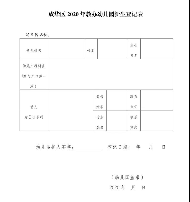 (3)《成华区2020年教办幼儿园新生登记表》(附件2)和《诚信承诺书》(附件3)(家长自行下载打印);