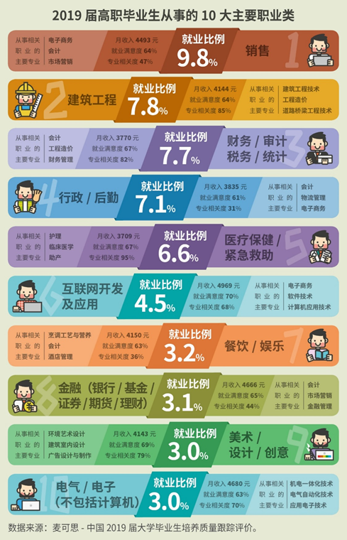 从毕业生就业岗位的占比来看,2019届高职毕业生从事最多的职业类是“销售”(9.8%),其后是“建筑工程”(7.8%)、“财务/审计/税务/统计”(7.7%)、“行政/后勤”(7.1%)、“医疗保健/紧急救助”(6.6%)。