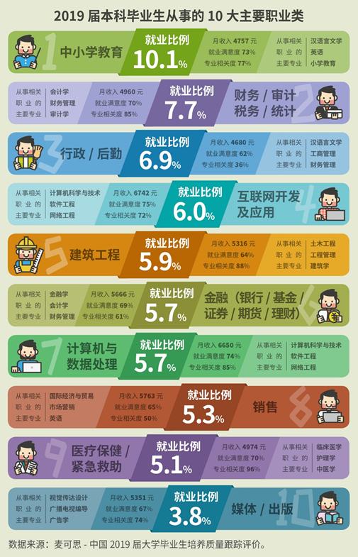 从毕业生就业岗位的占比来看,2019届本科毕业生就业最多的职业类是“中小学教育”(10.1%),其后是“财务/审计/税务/统计”(7.7%)、“行政/后勤”(6.9%)、“互联网开发及应用”(6.0%)等。