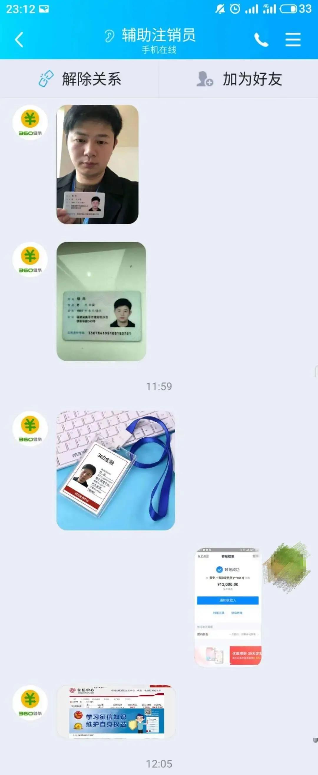 首先对方自称为360金融服务中心的工作人员,能准确地说出该同学的个人信息,包括就读于某所大学以及身份证号码,并称该同学之前注册了360借条APP账户,为响应国家相关政策,不允许学生贷款,故需要该同学配合注销贷款账号。之后让该同学添加他们服务中心的QQ号2447242755,添加好友后工作人员要求全程语音录音对接系统。