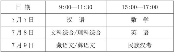 2.全省高考(一类模式高考除外)于7月7、8日统一组织进行。各科目考试时间(北京时间)安排如下:
