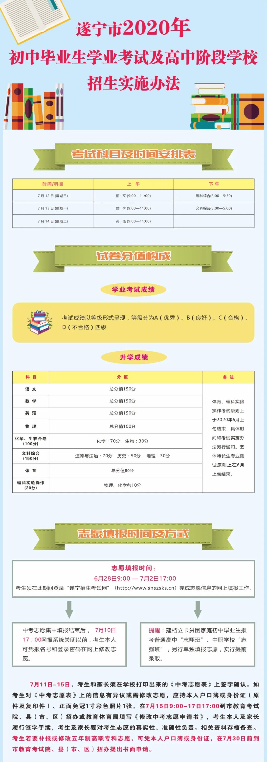 2020年遂宁市中考志愿填报时间为6月28日9:00 — 7月2日17:00,考试时间为2020年7月12日—14日。考试成绩公布后,考生本人凭报名号和个人登录密码在遂宁市教育和体育网查询。