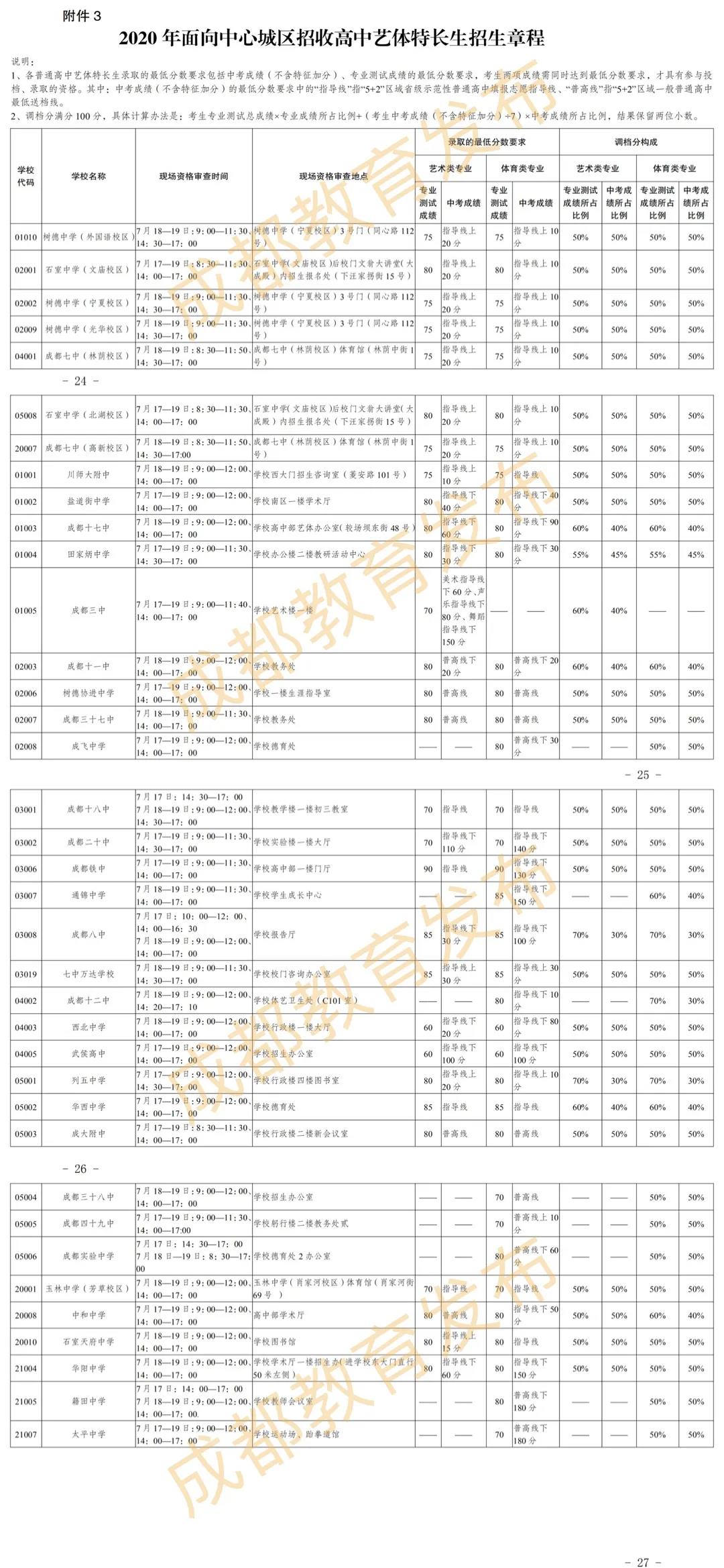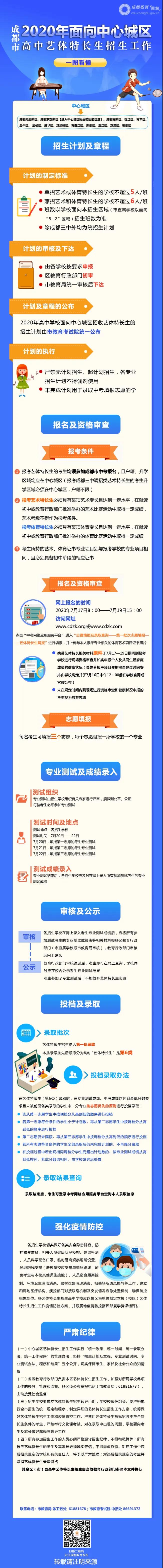根据《成都市招生考试委员会 成都市教育局关于印发〈2020年成都市高中阶段教育学校统一招生(招收初中毕业生)考试工作实施规定〉的通知》(成招考委〔2020〕8号)精神,现将2020年面向中心城区(指成都天府新区、成都东部新区【纳入中心城区招生范围的区域】、成都高新区、锦江区、青羊区、金牛区、武侯区、成华区、龙泉驿区、青白江区、新都区、温江区、双流区、郫都区,下同)高中艺体特长生招生工作有关事宜通知如下。