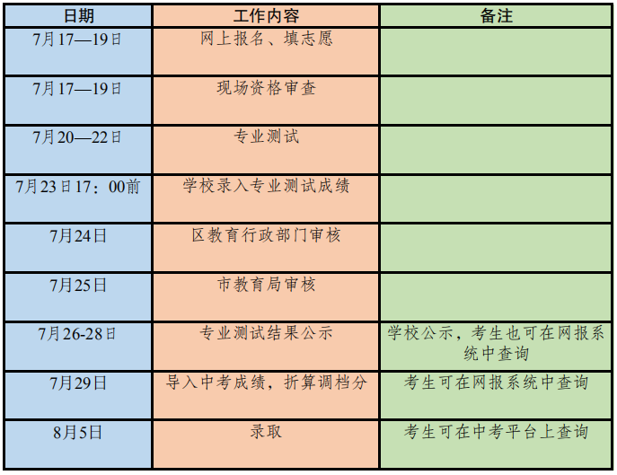 各高中学校也应在学校网站主页上公布本校艺体特长生招生计划、各项目录取要求、各项目专业测试办法、住宿条件、中考成绩及专业测试成绩的最低分数要求、调档分构成办法等信息。