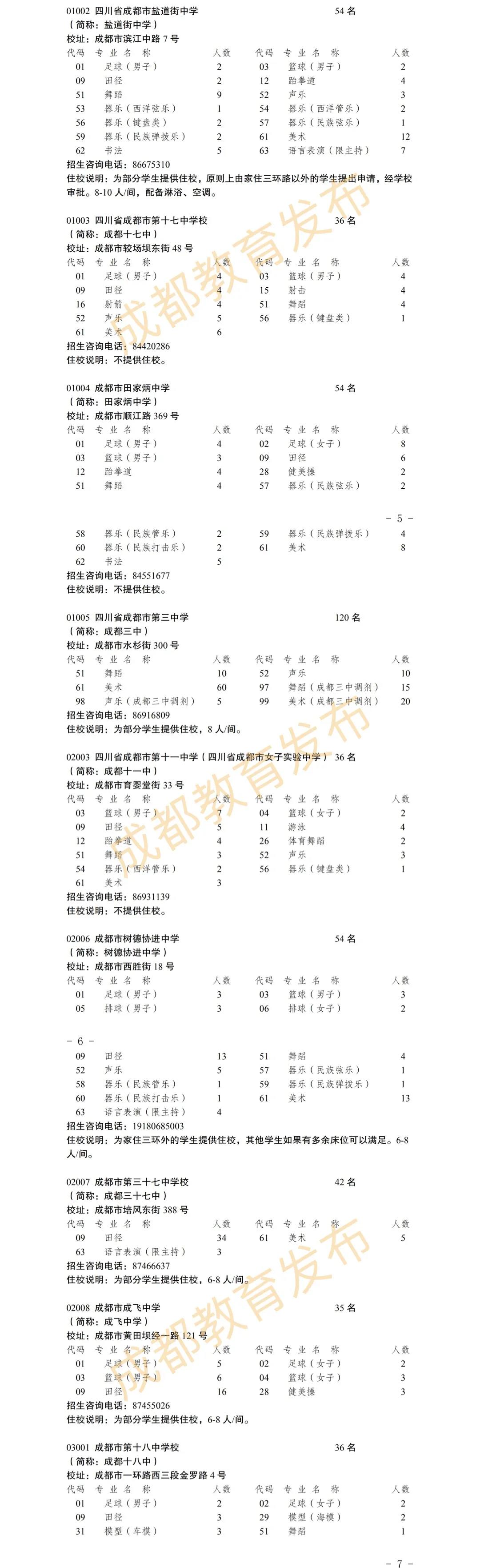 高中学校艺体特长生招生计划的制定标准为:单招艺术或体育特长生的学校不超过5人/班,兼招艺术和体育特长生的学校不超过6人/班,班数以学校面向本招生区域(市直属学校以面向“5+2”区域)招生班数为准,除成都三中外均为统招生计划。