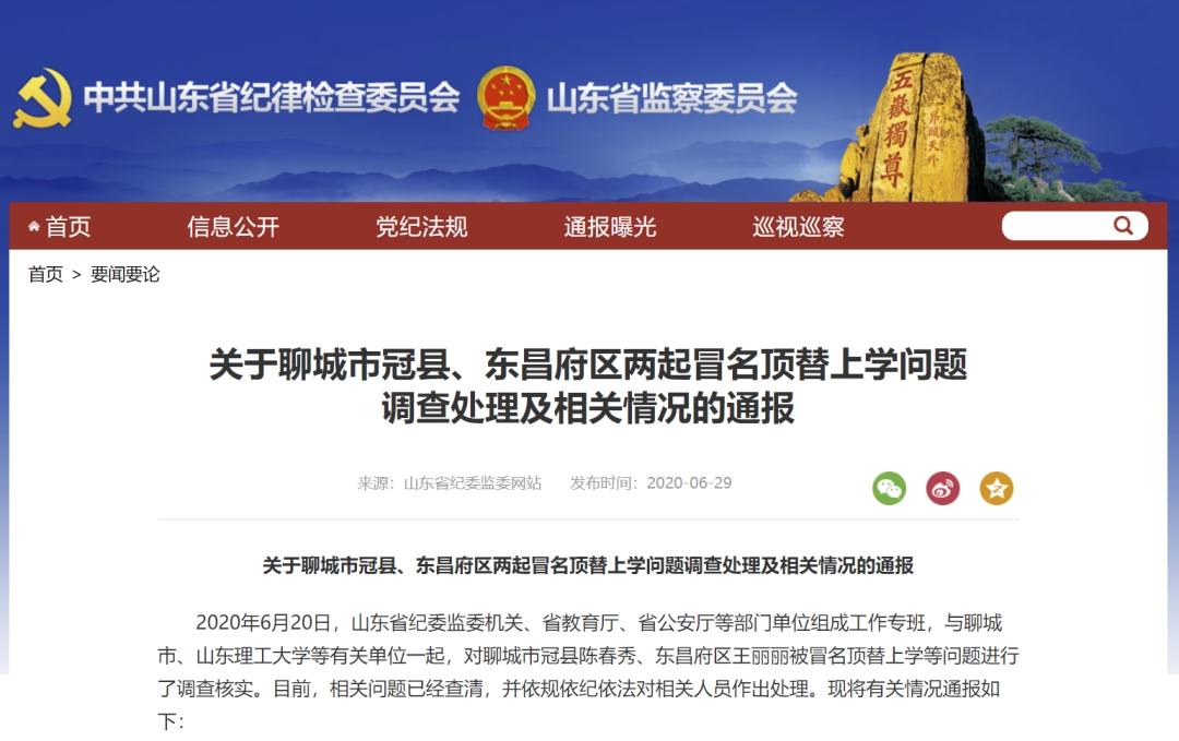 2020年6月20日,山东省纪委监委机关、省教育厅、省公安厅等部门单位组成工作专班,与聊城市、山东理工大学等有关单位一起,对聊城市冠县陈春秀、东昌府区王丽丽被冒名顶替上学等问题进行了调查核实。目前,相关问题已经查清,并依规依纪依法对相关人员作出处理。现将有关情况通报如下: