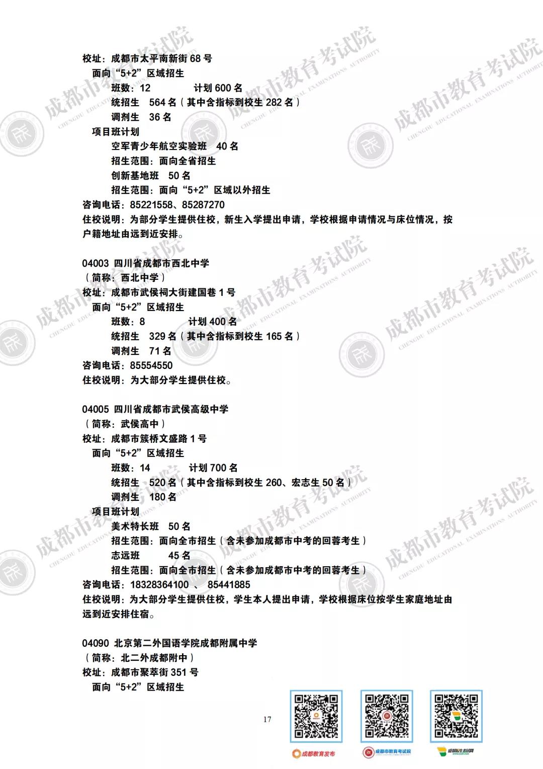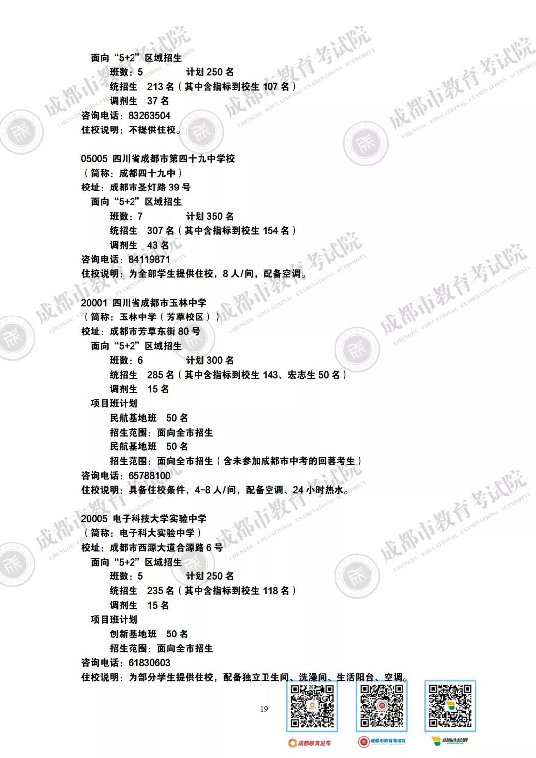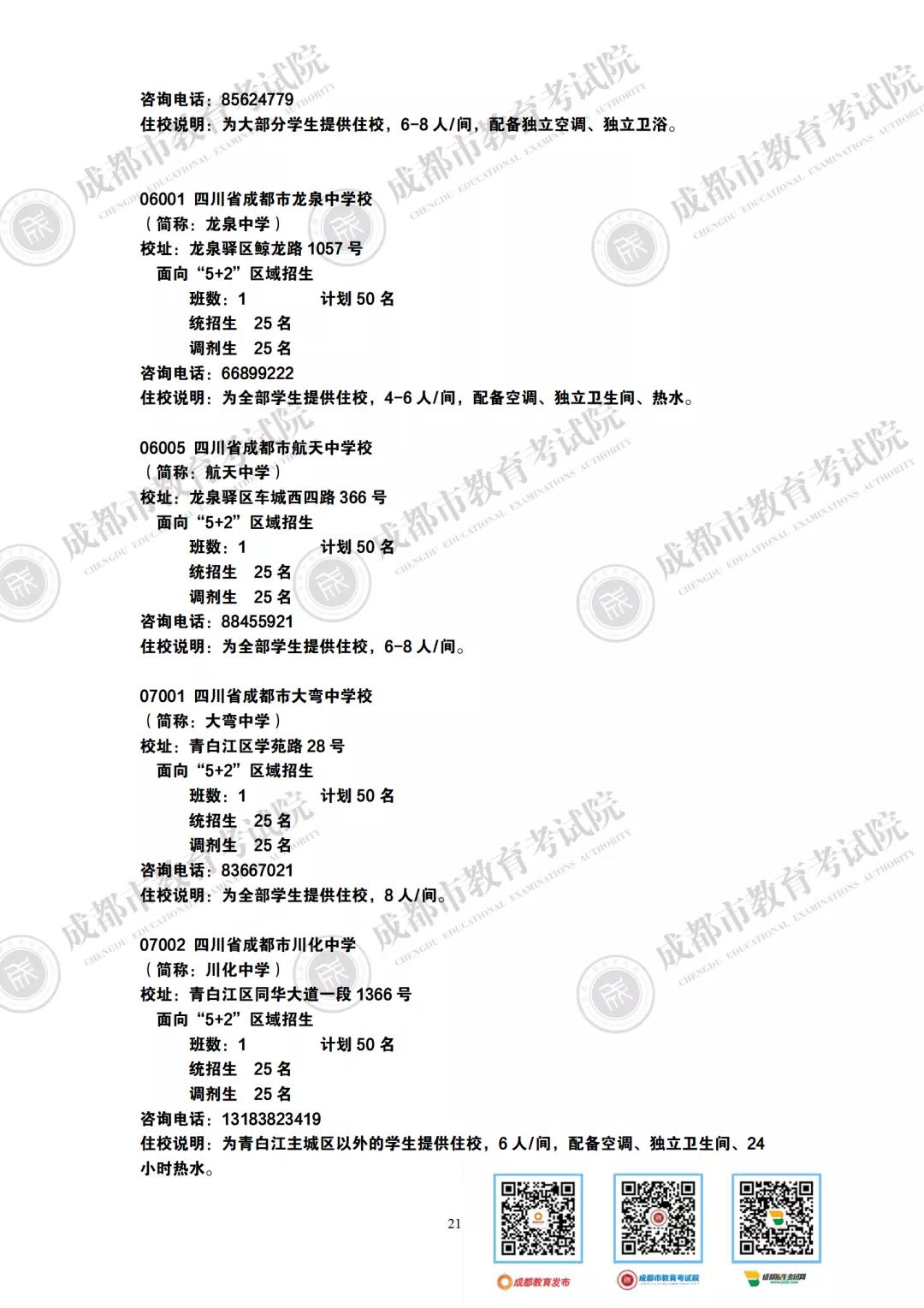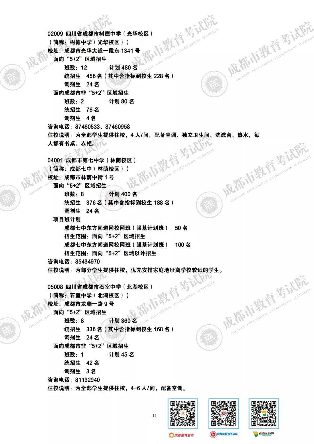 今年,石室中学、成都七中和树德中学等“5+2”区域的优质高中学校面向成都市全市(含非“5+2”区域)招收41个班。棠湖中学、双流中学、新都一中、龙泉中学、温江中学、大弯中学、郫都一中、简阳中学、新津中学、大邑中学、彭州中学、金堂中学、崇庆中学、蒲江中学、邛崃一中等非“5+2”区域的优质高中学校面向“5+2”区域招收26个班1300人,较2019年增加13个班650人。