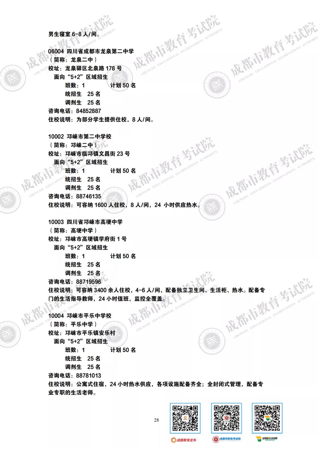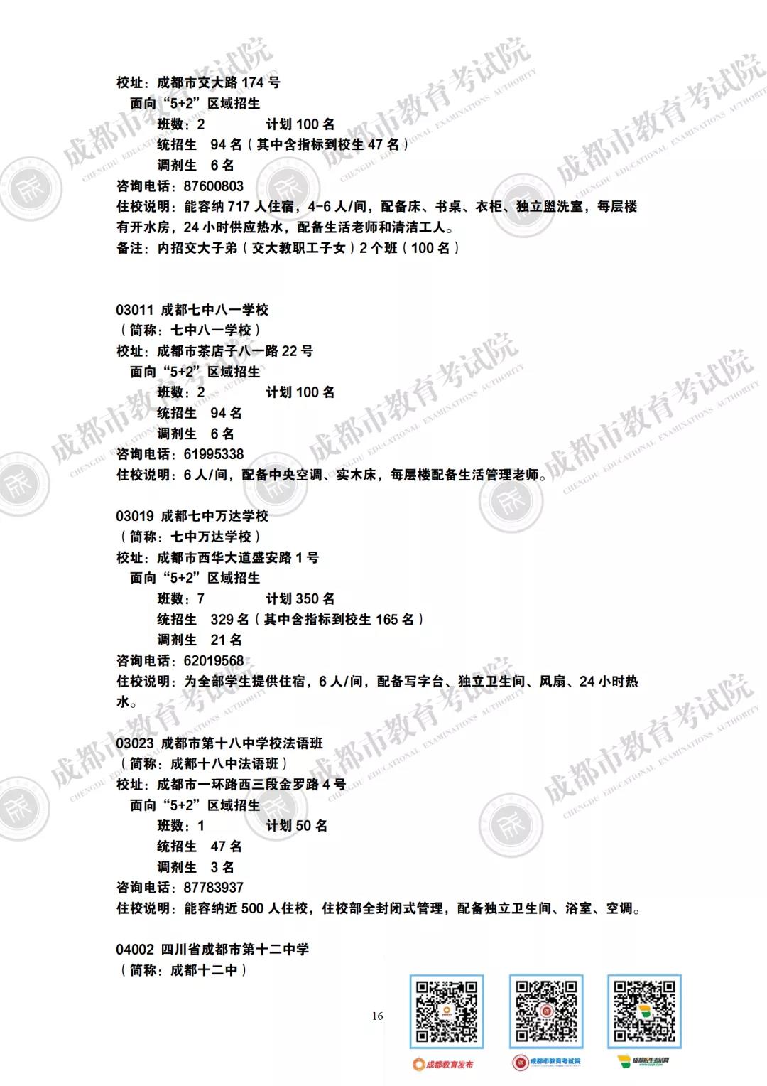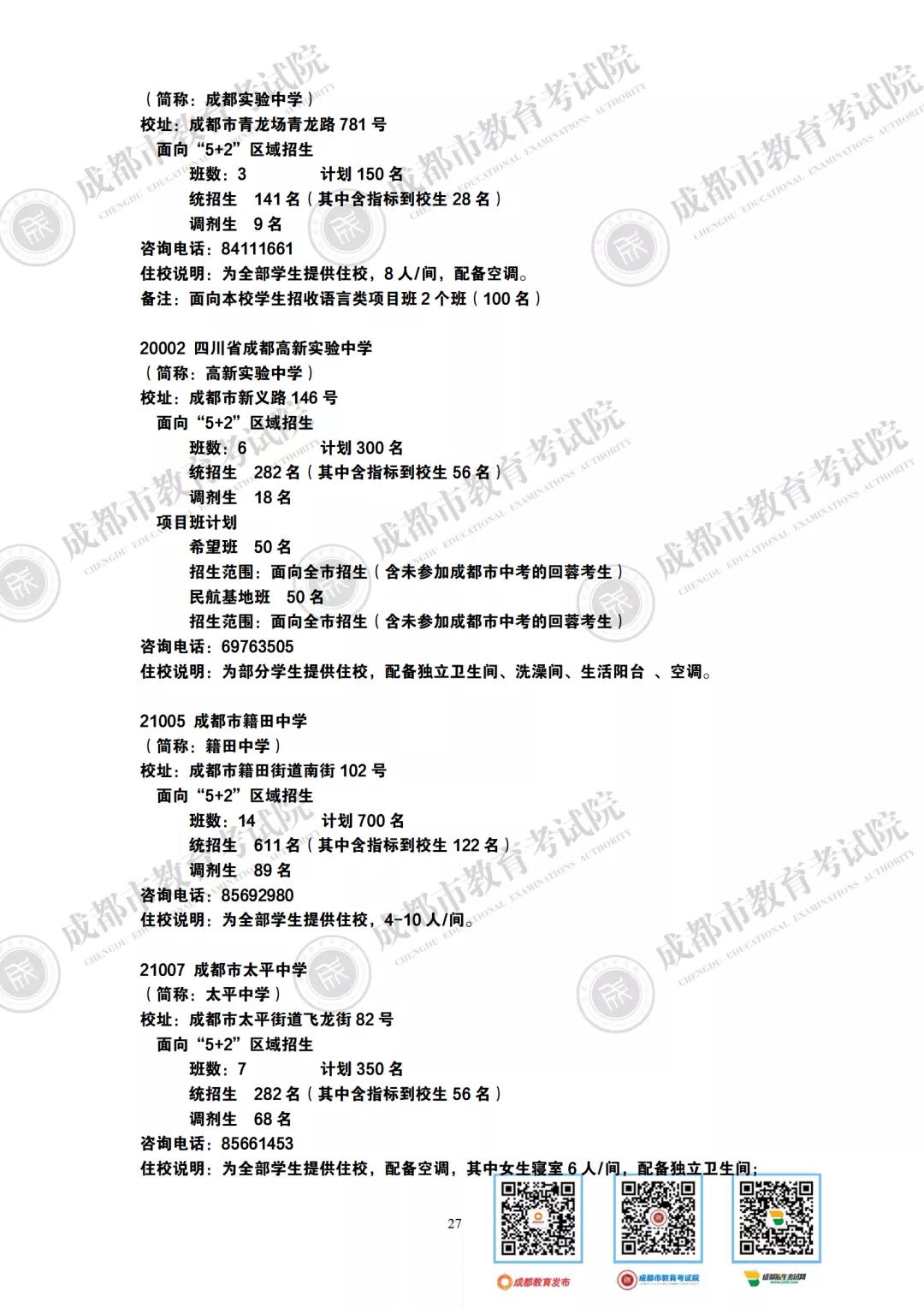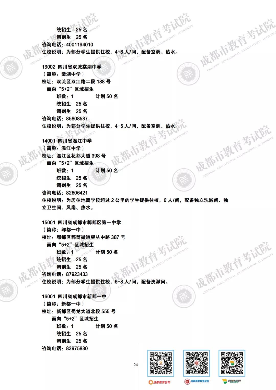今年,石室中学、成都七中和树德中学等“5+2”区域的优质高中学校面向成都市全市(含非“5+2”区域)招收41个班。棠湖中学、双流中学、新都一中、龙泉中学、温江中学、大弯中学、郫都一中、简阳中学、新津中学、大邑中学、彭州中学、金堂中学、崇庆中学、蒲江中学、邛崃一中等非“5+2”区域的优质高中学校面向“5+2”区域招收26个班1300人,较2019年增加13个班650人。