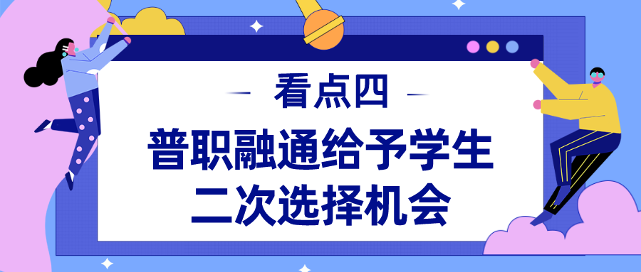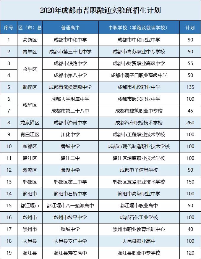 为推动普通高中育人方式改革,成都市将深入开展普职教育融通试点,给予学生二次选择机会。今年,中和职中等19所中职学校和中和中学等19所普通高中计划招收普职融通实验班40个,招生计划共1795名(详见延伸阅读一)。普职融通实验班列入中职学校招生计划,招生对象为具有成都户籍或具有成都市初中学籍的学生,注册中职学校学籍,在高中一年级结束前,普职融通实验班学生文化课成绩达到对口普通高中学校的成绩要求,可申请转入对口普通高中学校就读。