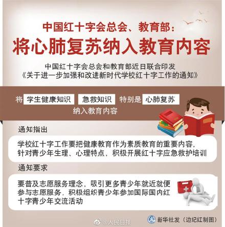 近日,中国红十字会总会和教育部联合印发通知,将学生健康知识、急救知识,特别是心肺复苏纳入教育内容。通知指出,学校红十字工作要把健康教育作为素质教育的重要内容,针对青少年生理、心理特点,积极开展红十字应急救护培训。