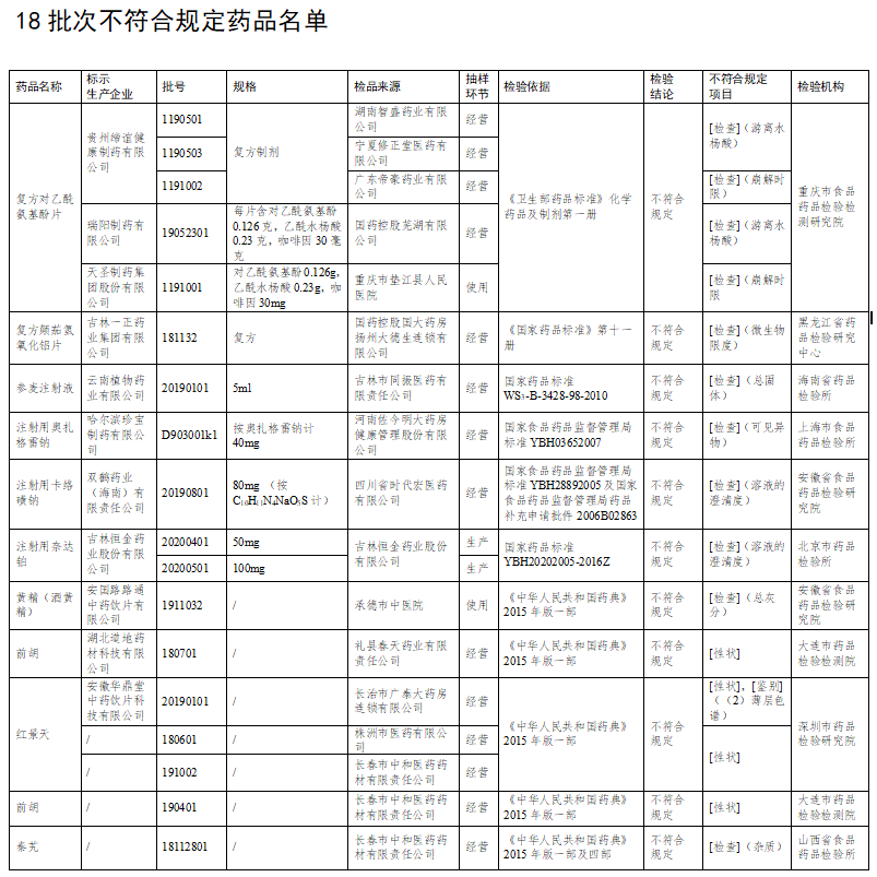 此外,经深圳市药品检验研究院、大连市药品检验检测院、山西省食品药品检验所分别检验,抽取自长春市中和医药药材有限责任公司的红景天、前胡、秦艽各1批次不符合规定,不符合规定项目包括性状、杂质。