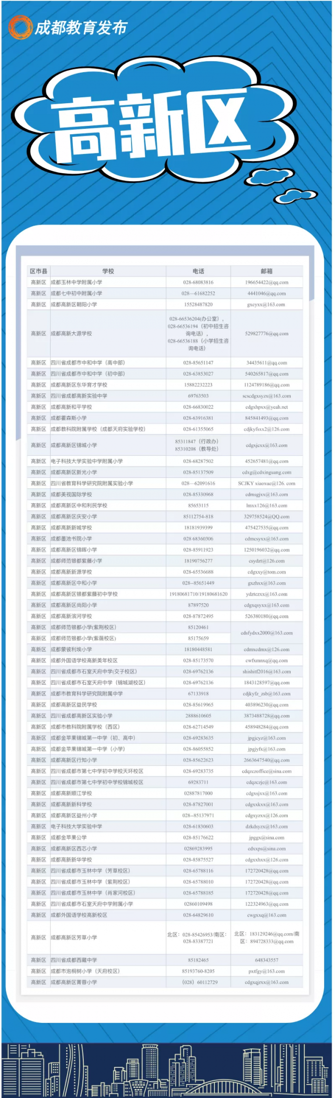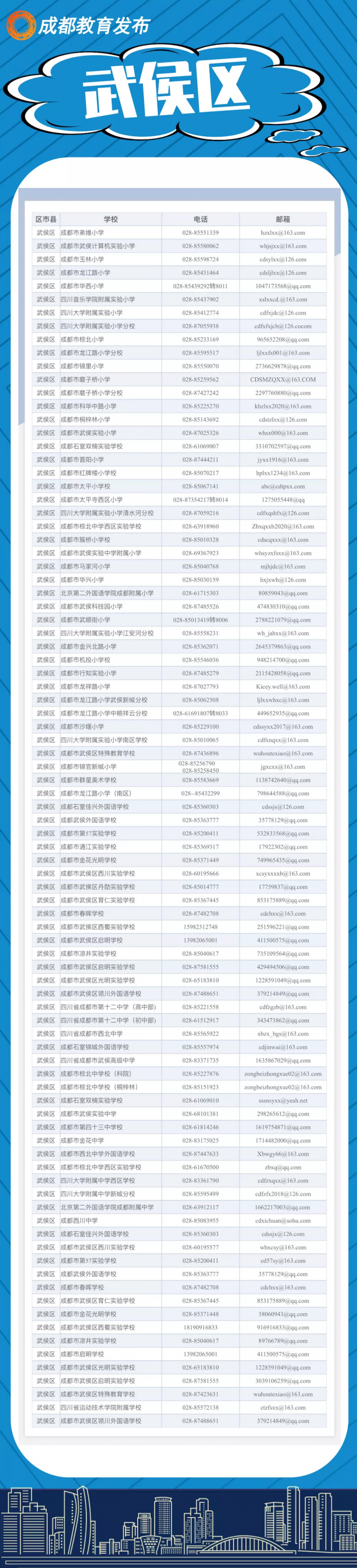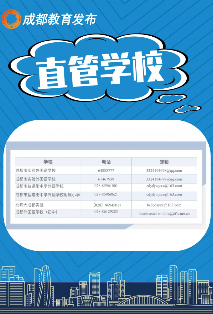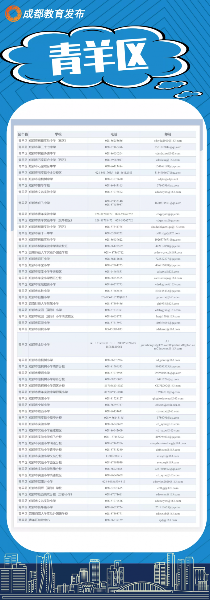 为进一步畅通家校面对面沟通渠道,解决学生学习期间的实际问题,减少问题处理中间环节,共促学生健康成长。成都市教育局统一向社会公布了全市各中小学的公开电话及电子邮箱,打通家长与学校沟通“最后一公里”,促进家校共育。
