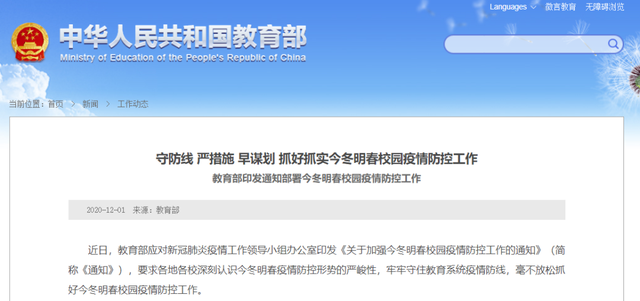 近日,教育部应对新冠肺炎疫情工作领导小组办公室印发《关于加强今冬明春校园疫情防控工作的通知》(简称《通知》),要求各地各校深刻认识今冬明春疫情防控形势的严峻性,牢牢守住教育系统疫情防线,毫不放松抓好今冬明春校园疫情防控工作。