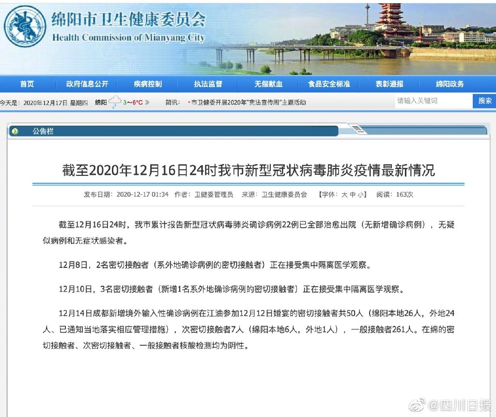 12月14日成都新增境外输入性确诊病例在江油参加12月12日婚宴的密切接触者共50人(绵阳本地26人,外地24人、已通知当地落实相应管理措施),次密切接触者7人(绵阳本地6人,外地1人),一般接触者261人。在绵的密切接触者、次密切接触者、一般接触者核酸检测均为阴性。
