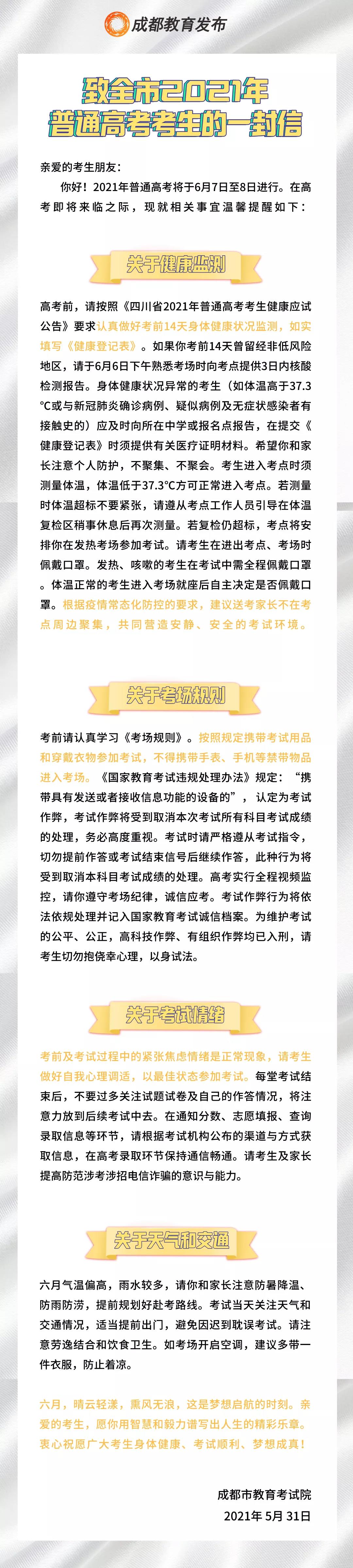 2021年6月7日、8日,高考即将拉开帷幕。5月31日,成都市教育考试院给全市学生发出一封信,提醒考前14天曾留经非风险地区的考生:6月6日下午熟悉考场时,向考点提供3日内核酸检测报告。体温低于37.3°才可以进入考点。