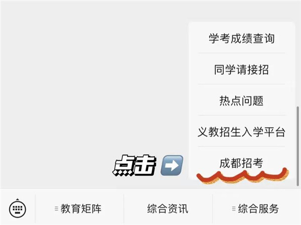 点击微信公众号底部菜单栏【综合服务】-【成都招考】